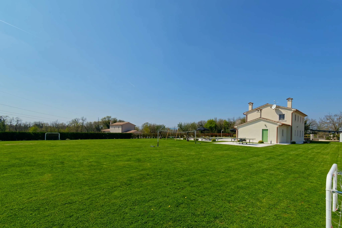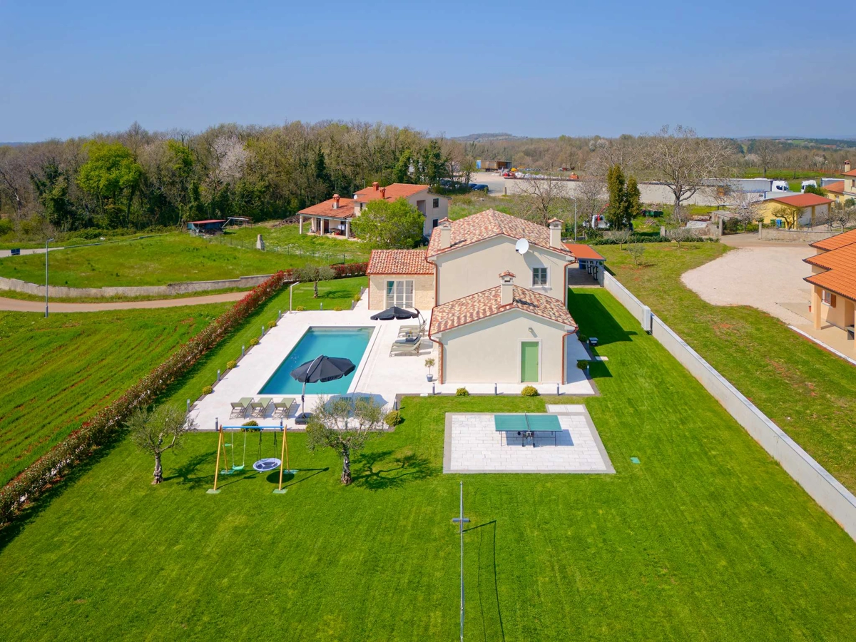 The villa features a swimming pool with hydromassage jets, a spacious terrace, and a charming garden – creating the perfect setting for relaxation. The outdoor area is equipped with a barbecue, an outdoor dining area, sun loungers, an outdoor shower, a children's playground, and a table tennis setup.