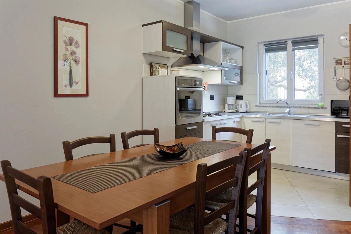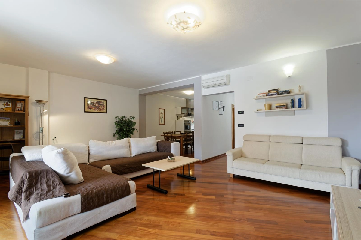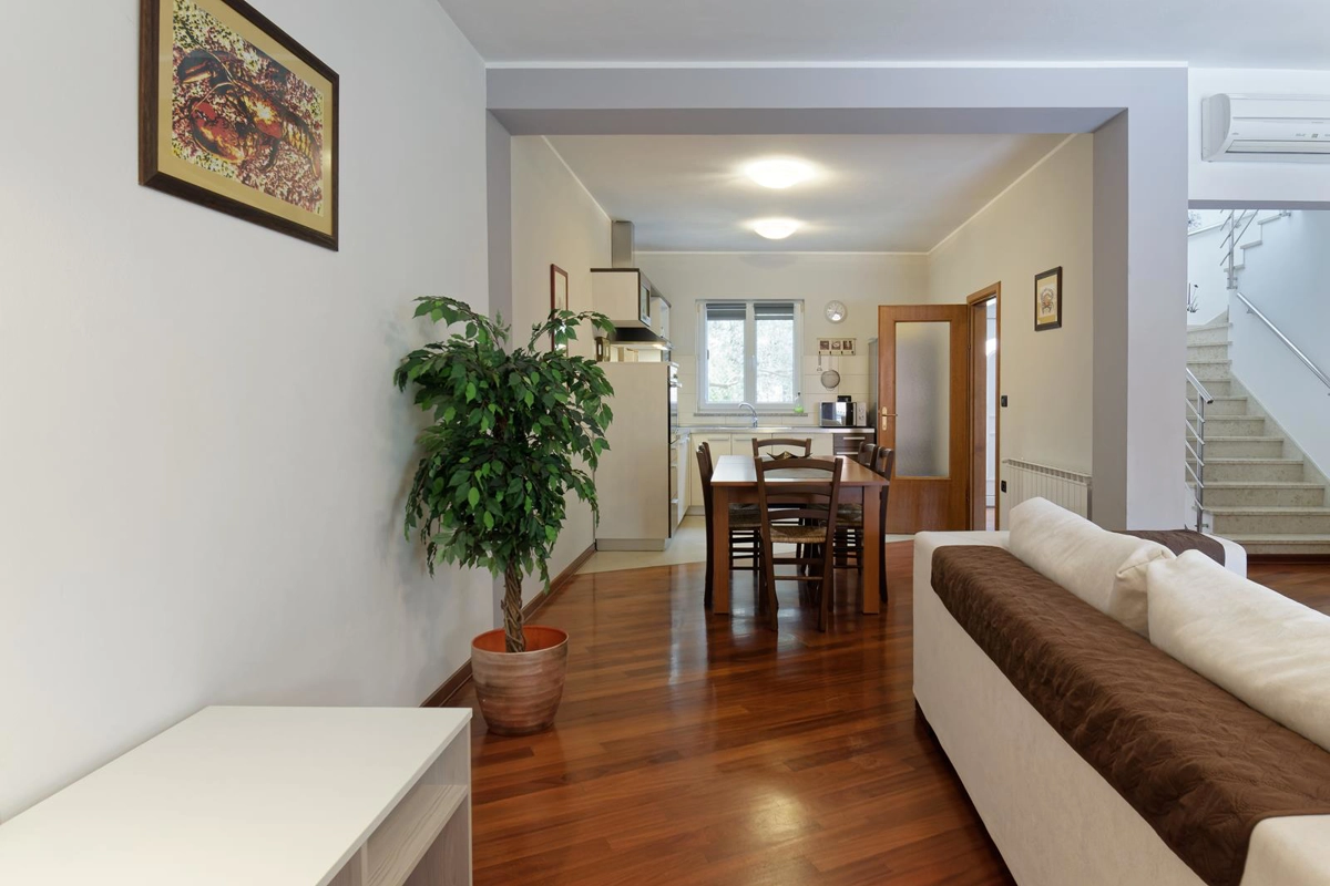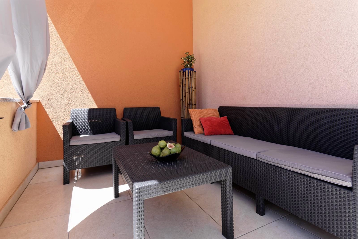 Apartment Maritea with private pool has 120 m2 of living space. The apartment has three bedrooms, a living room, two bathrooms, and a kitchen. The living room contains a satellite TV, a sofa, and a dining area. The bathroom has a shower and a hair dryer. The kitchen provides a dishwasher, oven, coffee machine, microwave, toaster, refrigerator, and can accommodate up to 6 people.