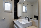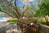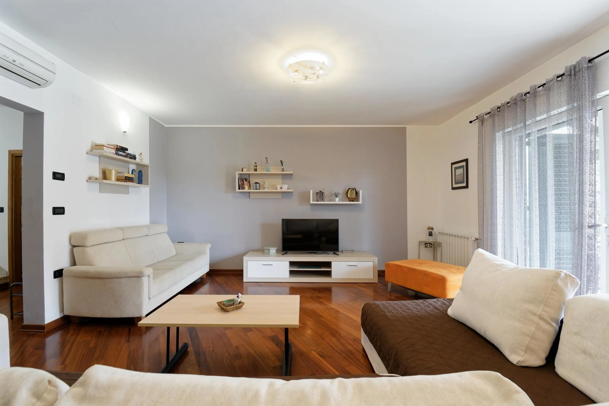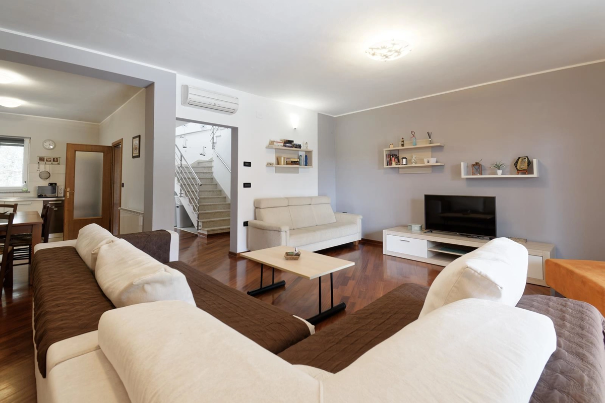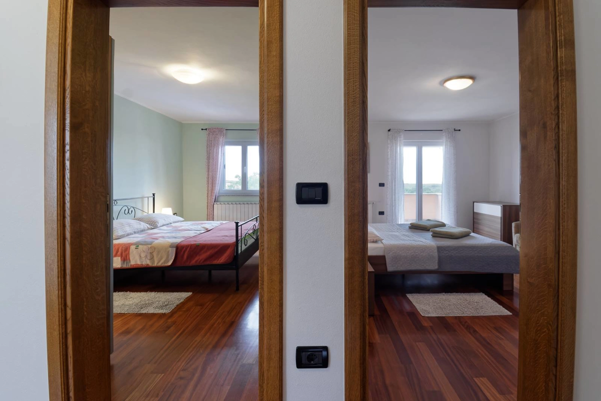 Apartment Maritea with private pool has 120 m2 of living space. The apartment has three bedrooms, a living room, two bathrooms, and a kitchen. The living room contains a satellite TV, a sofa, and a dining area. The bathroom has a shower and a hair dryer. The kitchen provides a dishwasher, oven, coffee machine, microwave, toaster, refrigerator, and can accommodate up to 6 people.