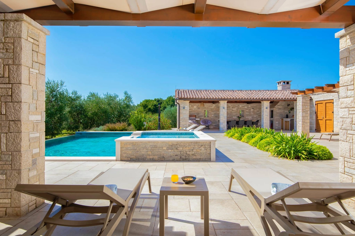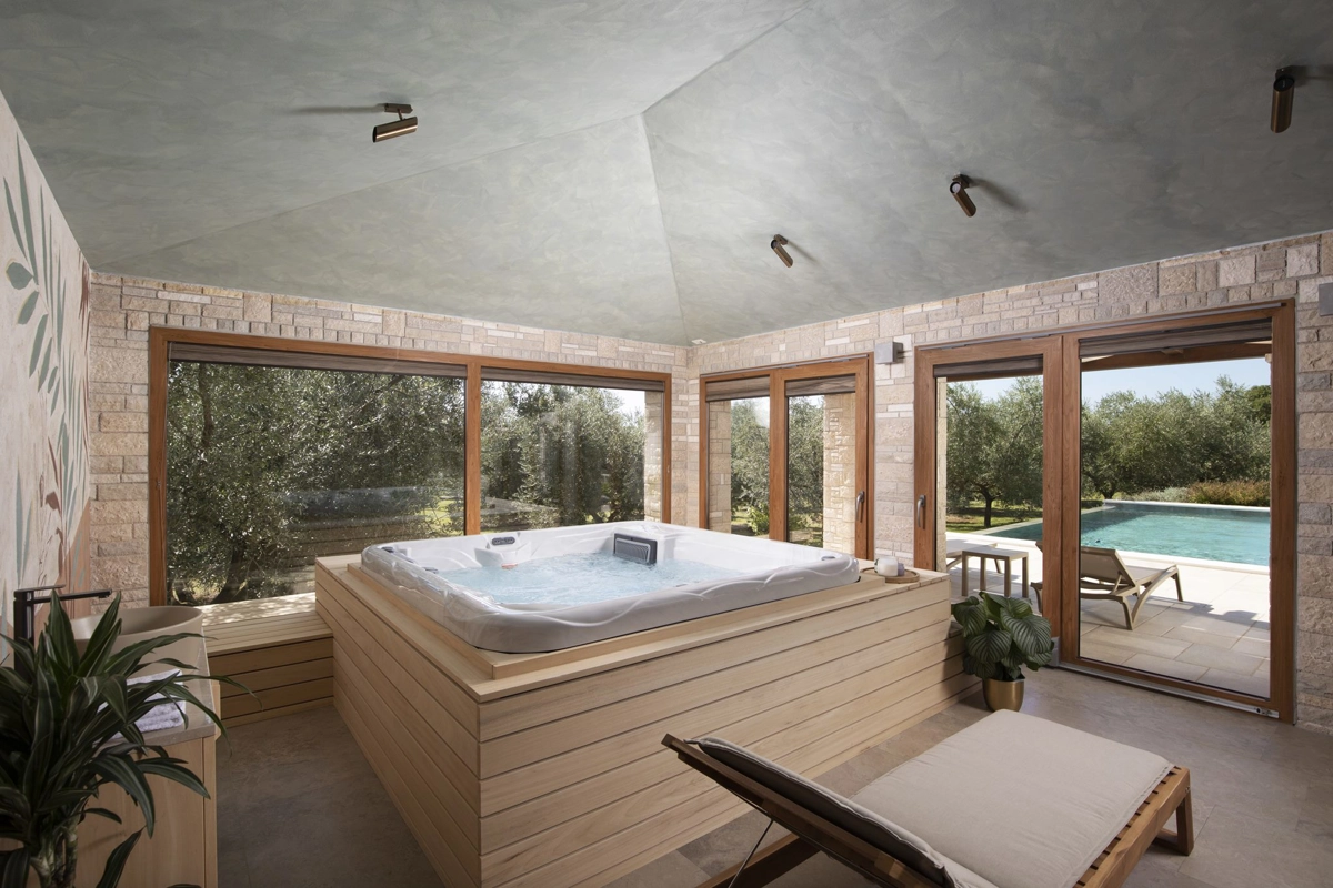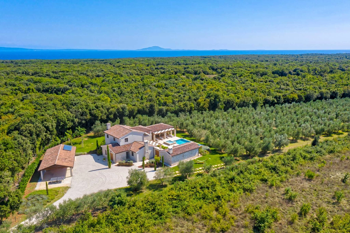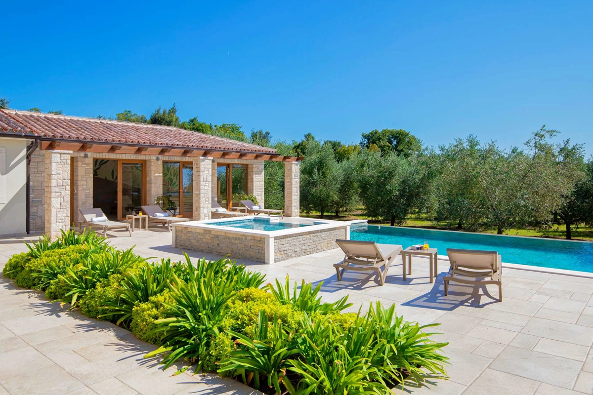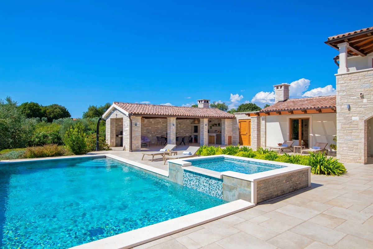 The villa features a stunning swimming pool as well as a small relaxation pool, a spacious terrace, and a lovely garden with olive trees, creating the perfect setting for relaxation. The outdoor area is equipped with a barbecue, a dining area, sun loungers, and an outdoor shower. Inside, the villa has 4 bedrooms, fully equipped kitchen and dining room, living room with a fireplace, 4 bathrooms and a separate toilet.