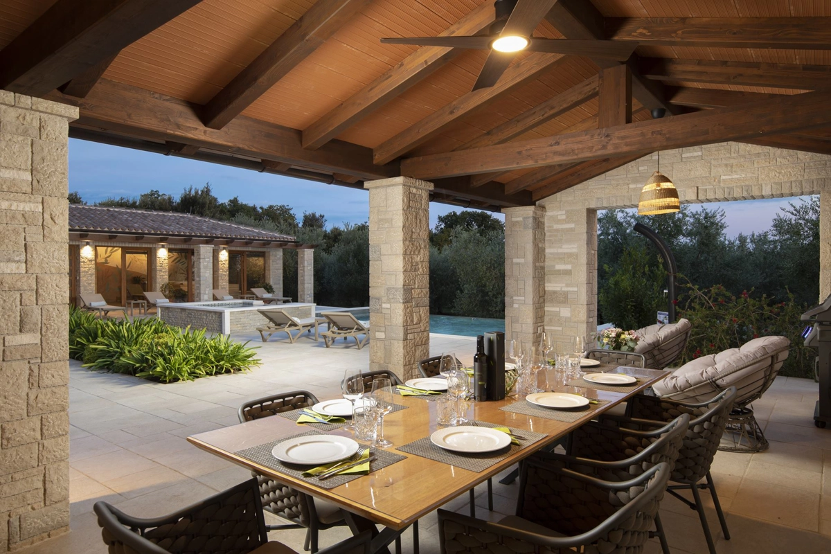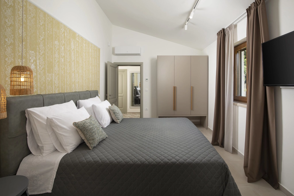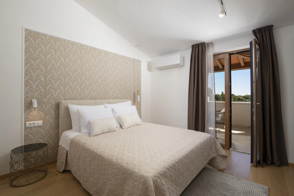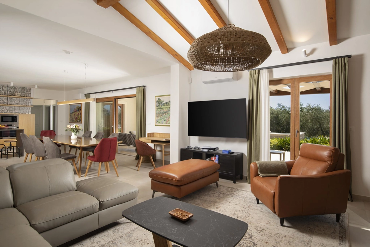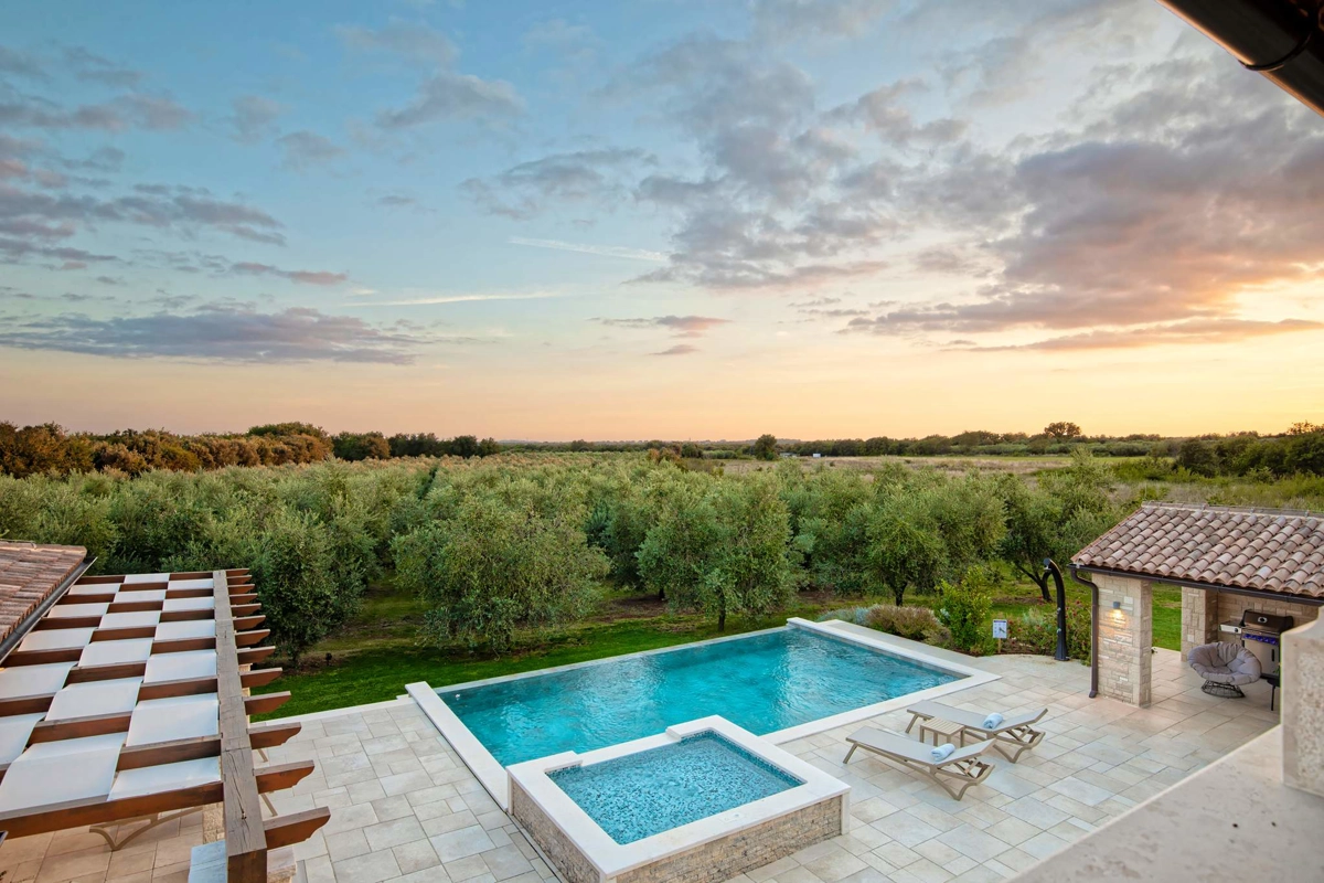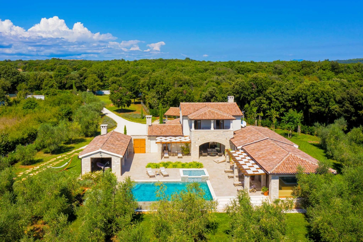 The villa features a stunning swimming pool as well as a small relaxation pool, a spacious terrace, and a lovely garden with olive trees, creating the perfect setting for relaxation. The outdoor area is equipped with a barbecue, a dining area, sun loungers, and an outdoor shower. Inside, the villa has 4 bedrooms, fully equipped kitchen and dining room, living room with a fireplace, 4 bathrooms and a separate toilet.
