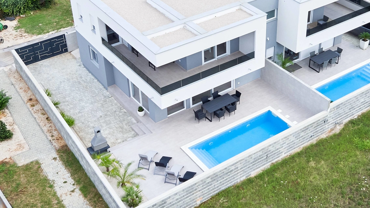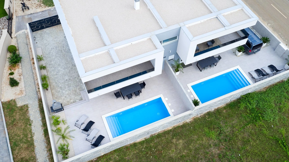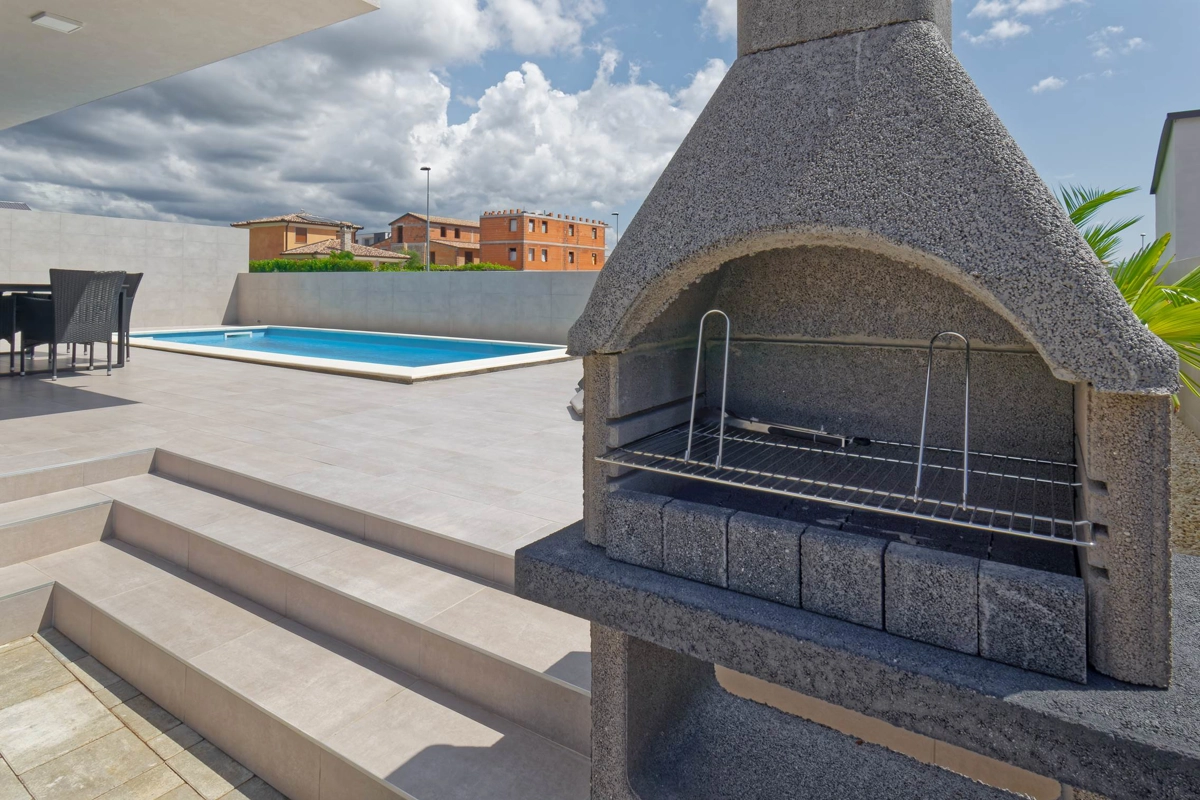 The villa also has an outdoor pool, outdoor dining area with a barbecue and a terrace.