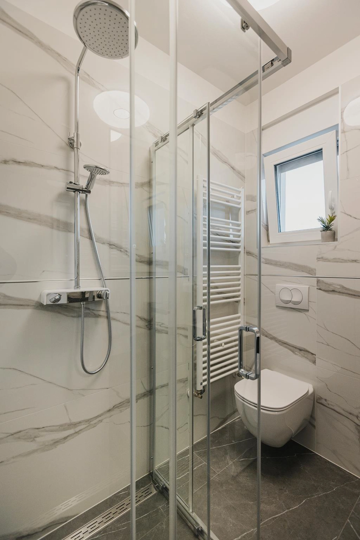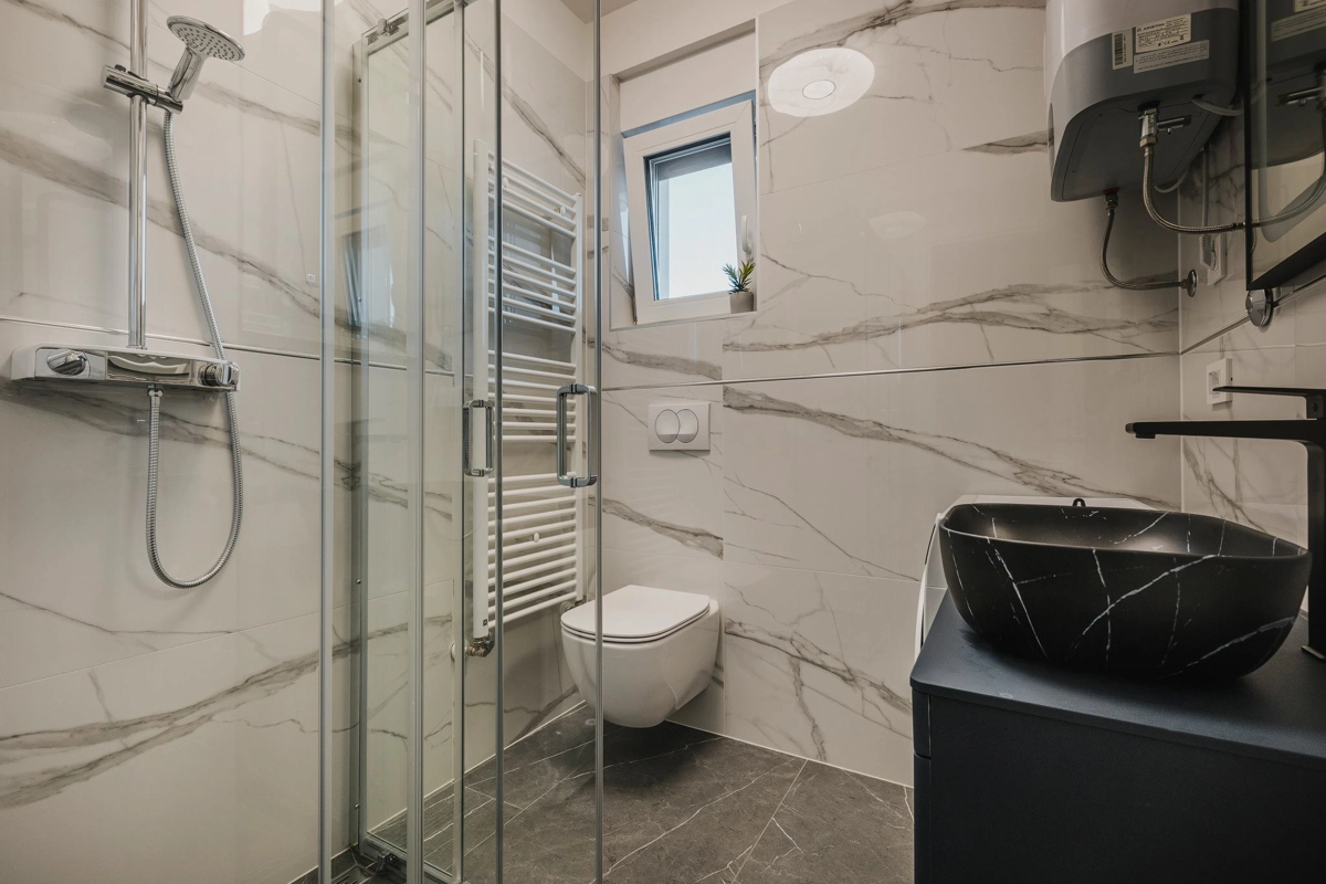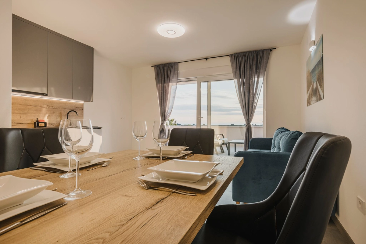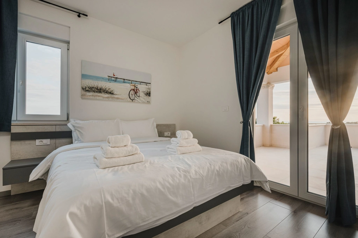 Apartment Ashka is a modern, sea-view apartment situated in Umag. Located on the first floor, it comfortably accommodates up to 3 guests. The spacious air-conditioned apartment has a terrace with stunning sea views and includes two cozy bedrooms, two bathrooms with showers, a living room with a flat-screen TV, a dining area, and a fully equipped kitchen. The nearest beach is only 1,5 km away.