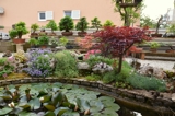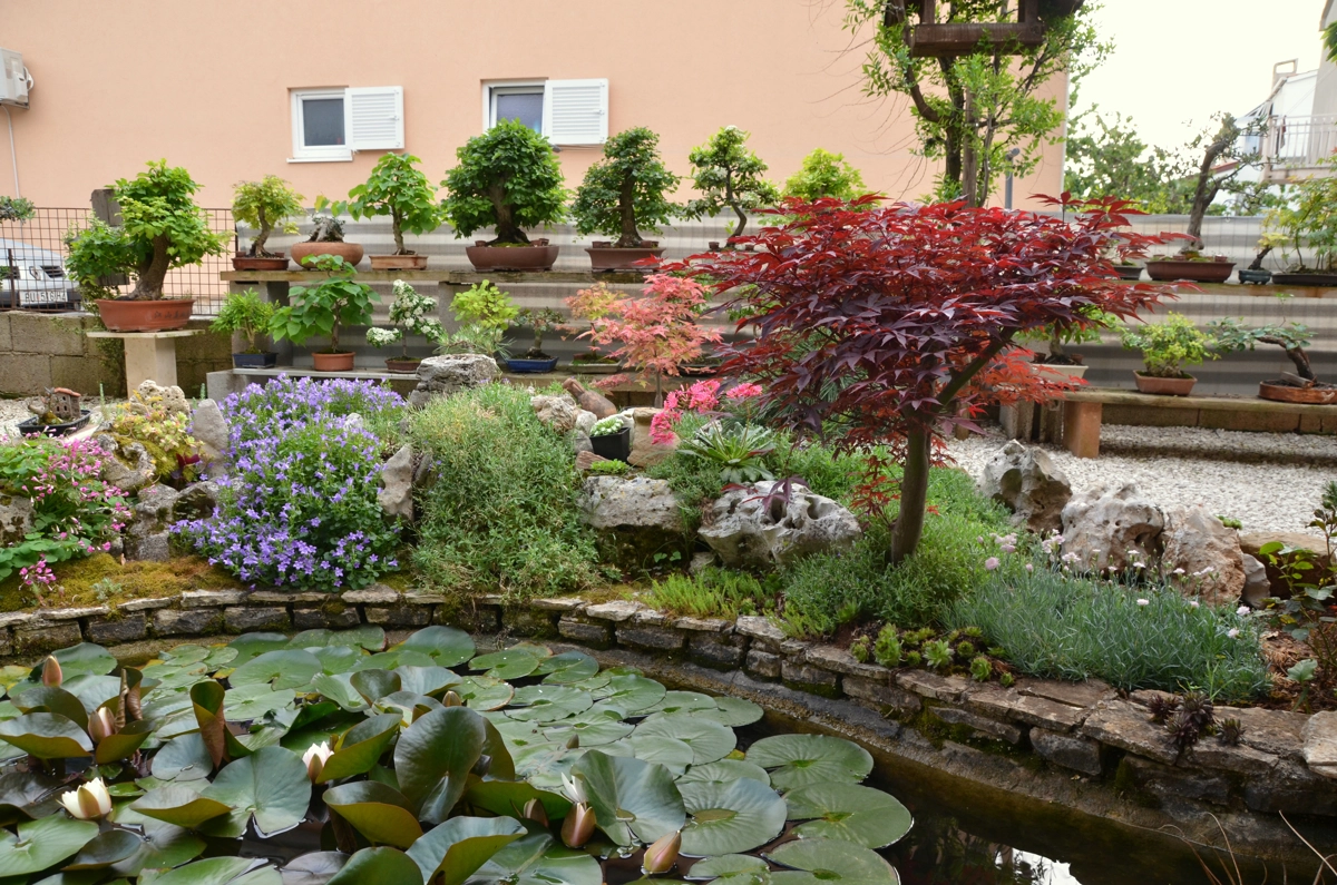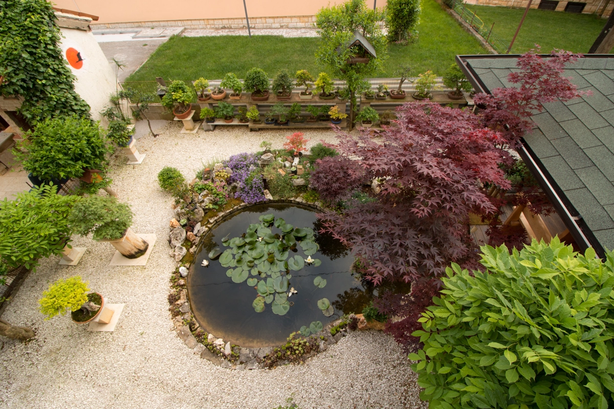 There is a beautiful garden surrounding the house that features a little pond and numerous bonsai trees.