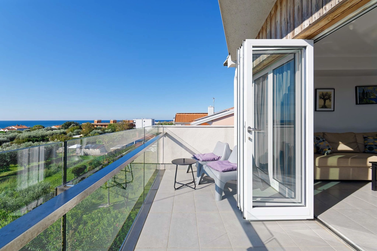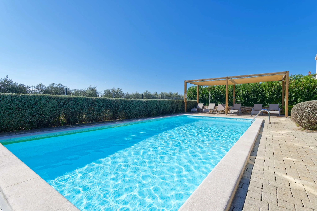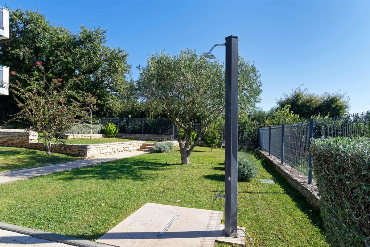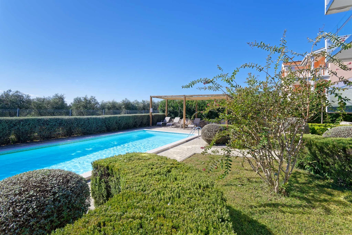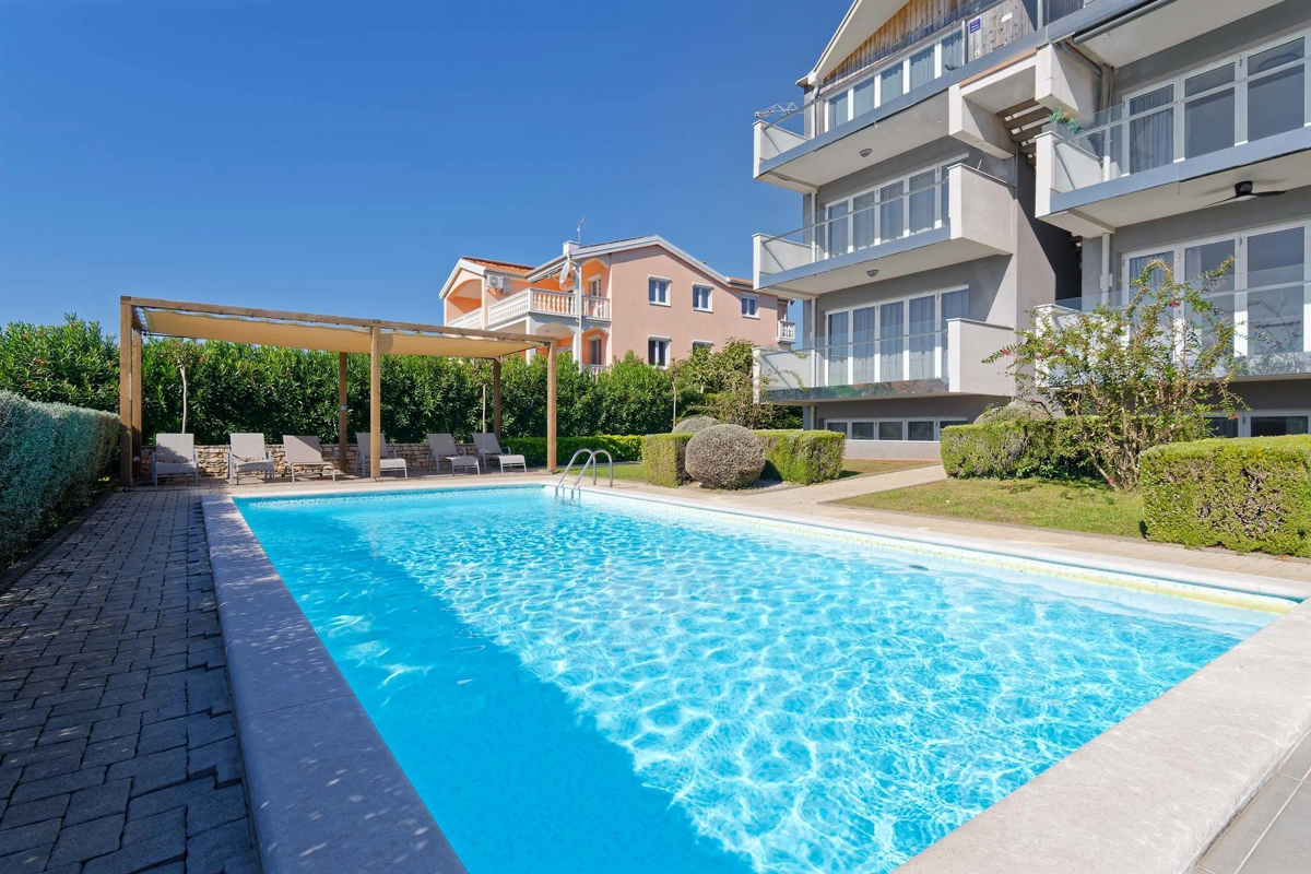Apartment La Vista is located in Zambratija, only 1km from the sea. The size of the apartment is 60 m² and is located on the second floor of a residential building. The apartment consists of 2 bedrooms, a bathroom, a separate toilet, an equipped kitchen, a dining area, a living room with a sofa bed, and a balcony. Outside guests have a shared swimming pool with sun loungers at their disposal, with an outdoor shower. The apartment can accommodate up to 4 people. Guests have free private parking for 1 car at their disposal.