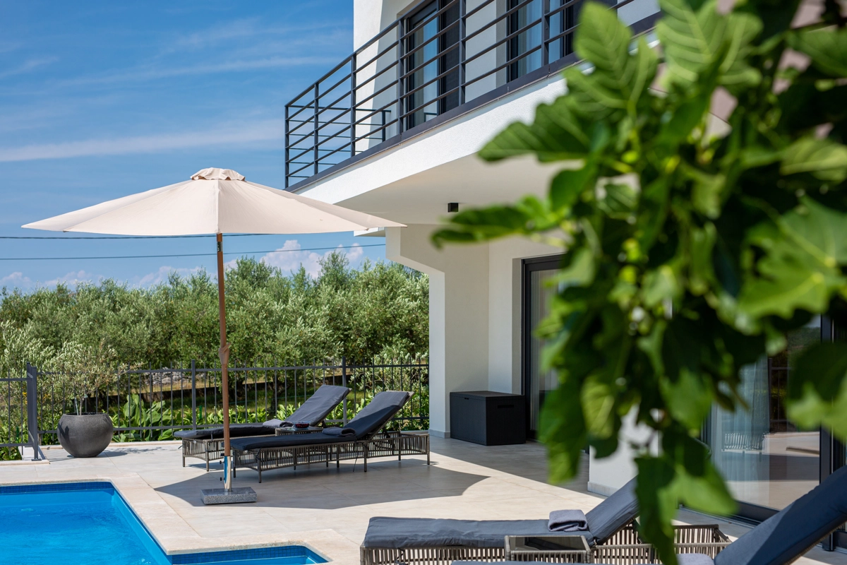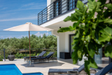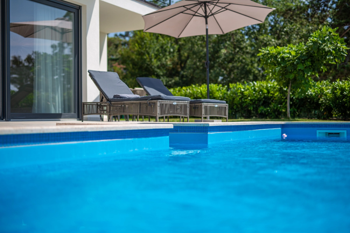 The pool is equipped with sun loungers, parasols and next to the pool there is a dining table with BBQ.