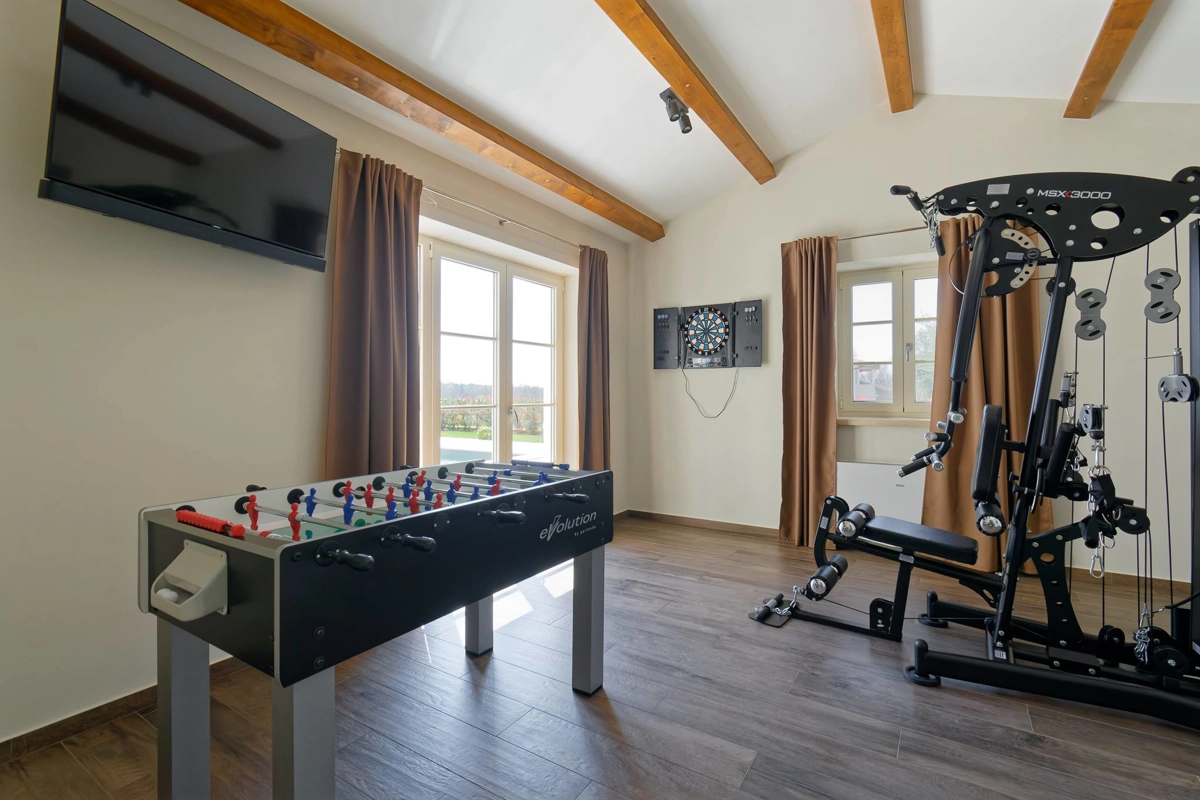 Inside, the villa offers four bedrooms, a fully equipped kitchen with a dining area, a cozy living room, five bathrooms, and a separate indoor space for fun and recreation, including table football, darts, and an exercise machine.