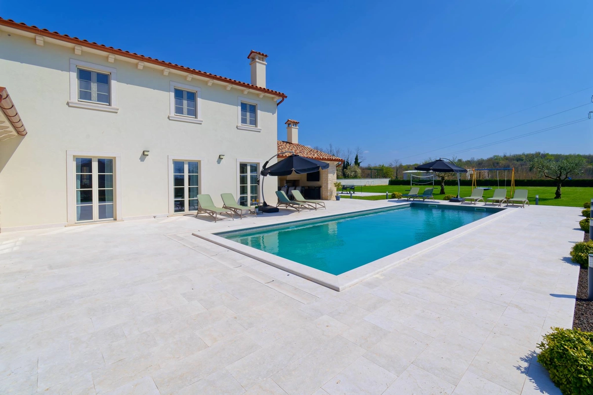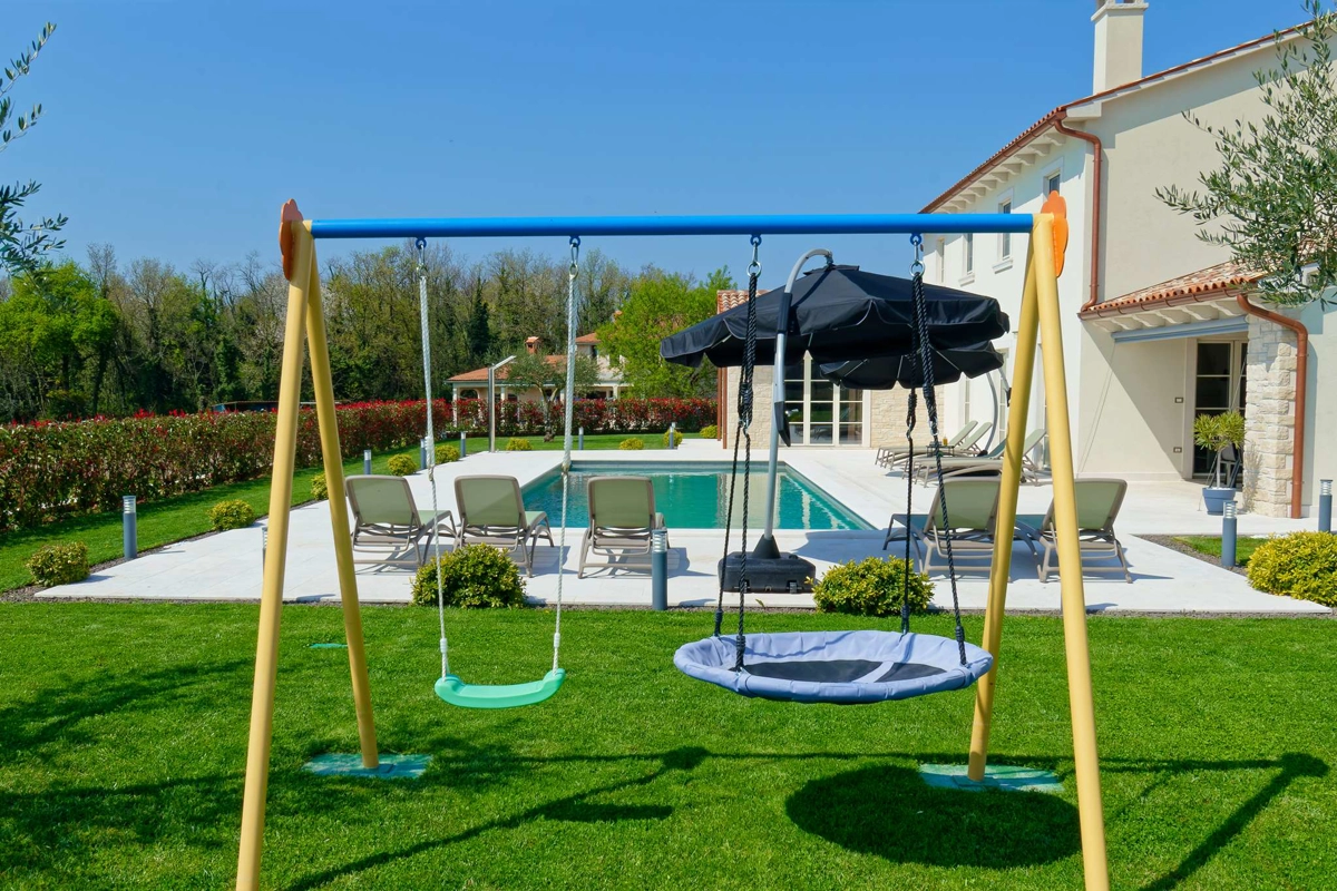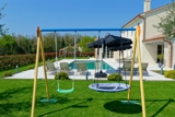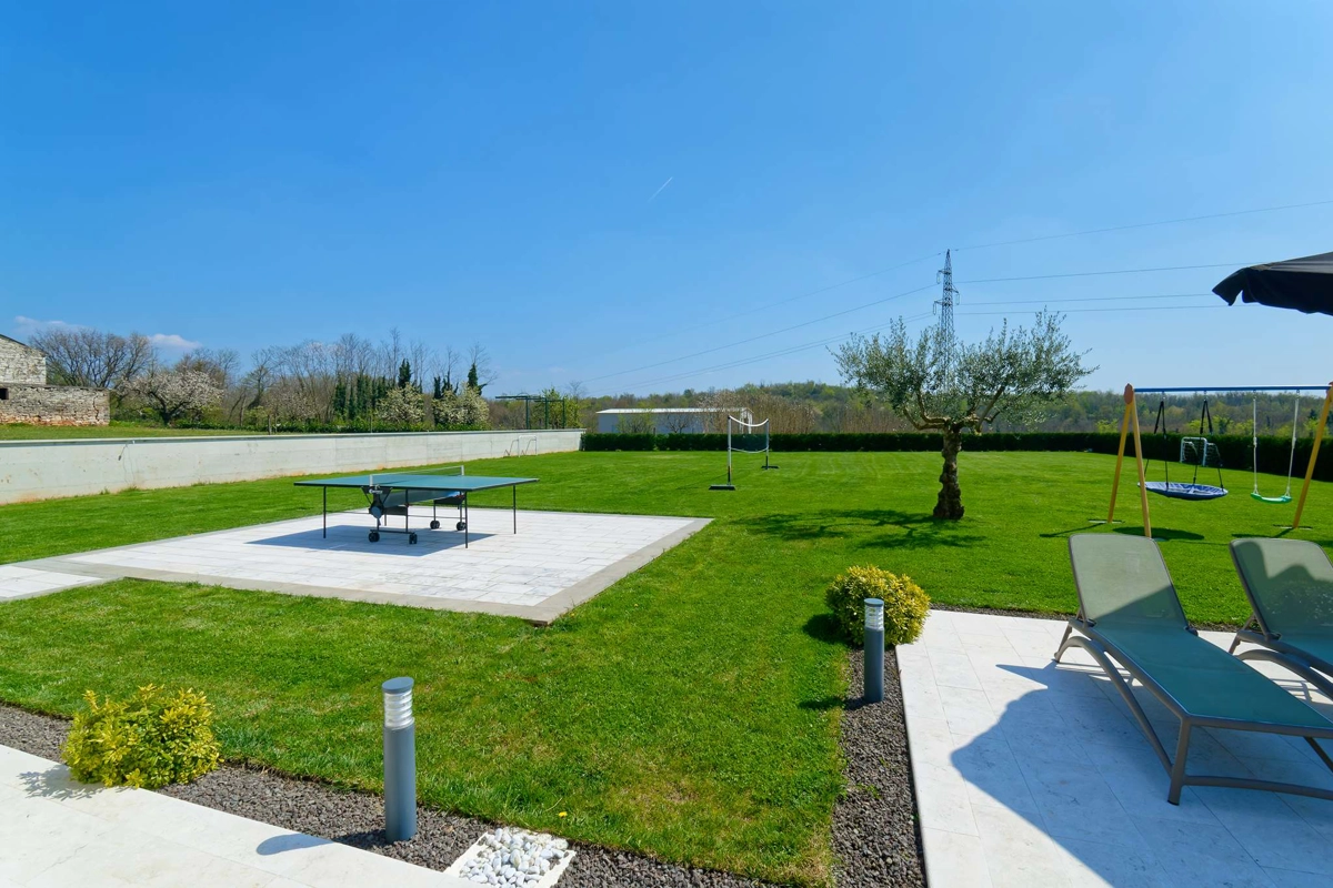 The villa features a swimming pool with hydromassage jets, a spacious terrace, and a charming garden – creating the perfect setting for relaxation. The outdoor area is equipped with a barbecue, an outdoor dining area, sun loungers, an outdoor shower, a children's playground, and a table tennis setup.